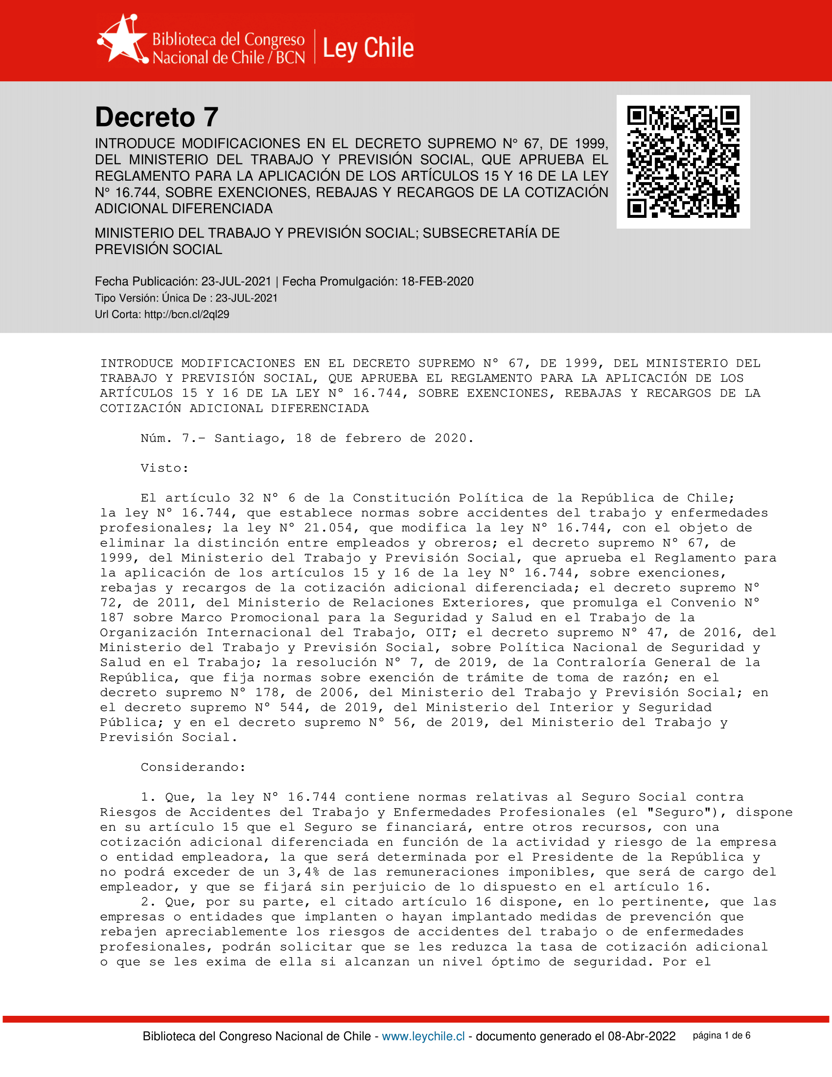 En el año 2021, hubo modificaciones introducidas por el D.S. N°7, de 2021, del Ministerio del Trabajo y Previsión Social, al D.S. N°67, de 1999, del mismo origen, que aprueba el Reglamento para la aplicación de los artículos 15 y 16 de la Ley N°16.744, sobre exenciones, rebajas y recargos de la cotización adicional diferenciada.