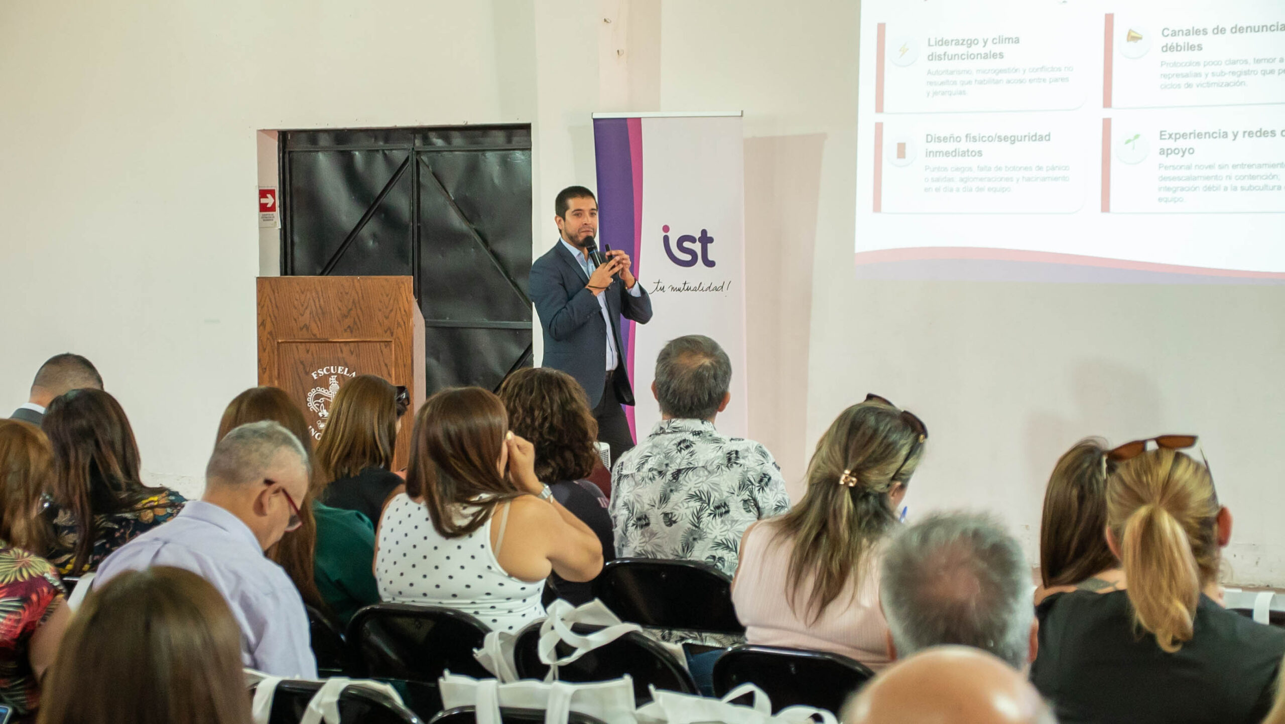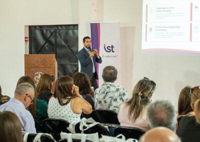 Durante la jornada, el Gerente de Factores Psicosociales de IST, Pablo González, y el Gerente de Soluciones Preventivas, Julio Lambert, abordaron temáticas clave para la comunidad educativa, tales como Ley Karin, salud mental, acompañamiento, centros de atención, gestión de accidentes, entre otros aspectos fundamentales para fortalecer una cultura preventiva en los entornos laborales.
