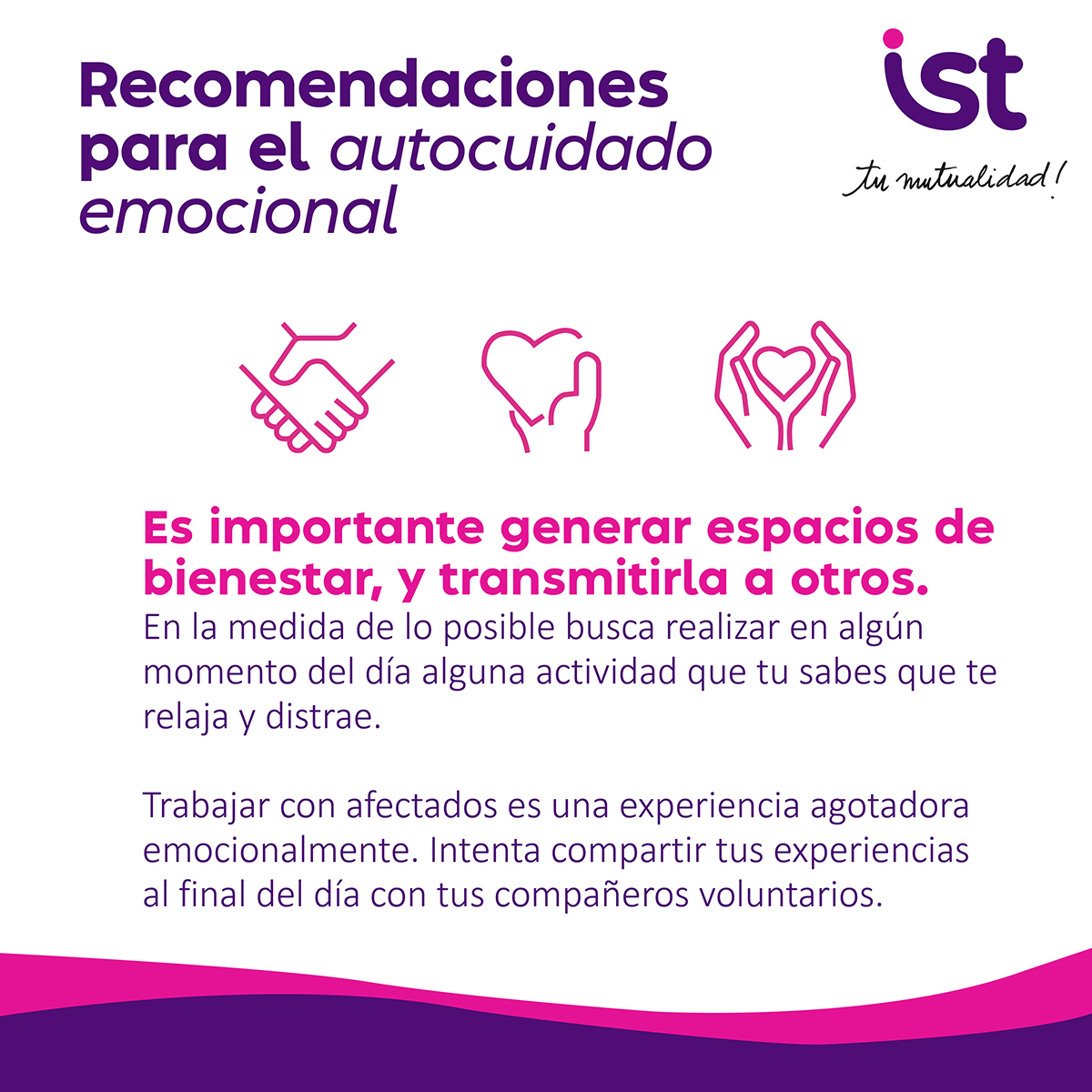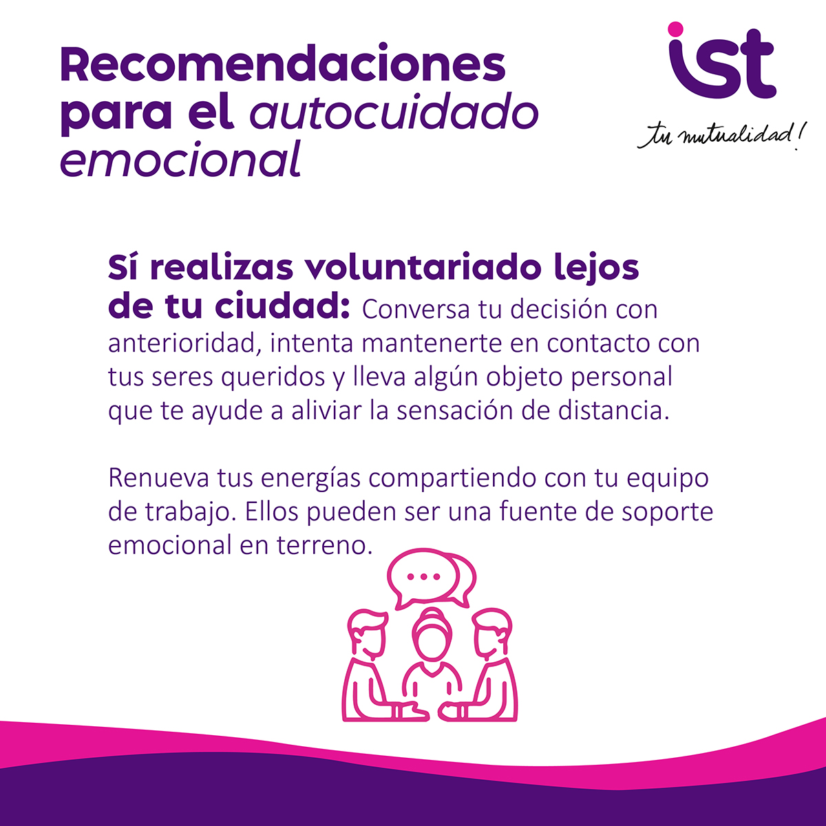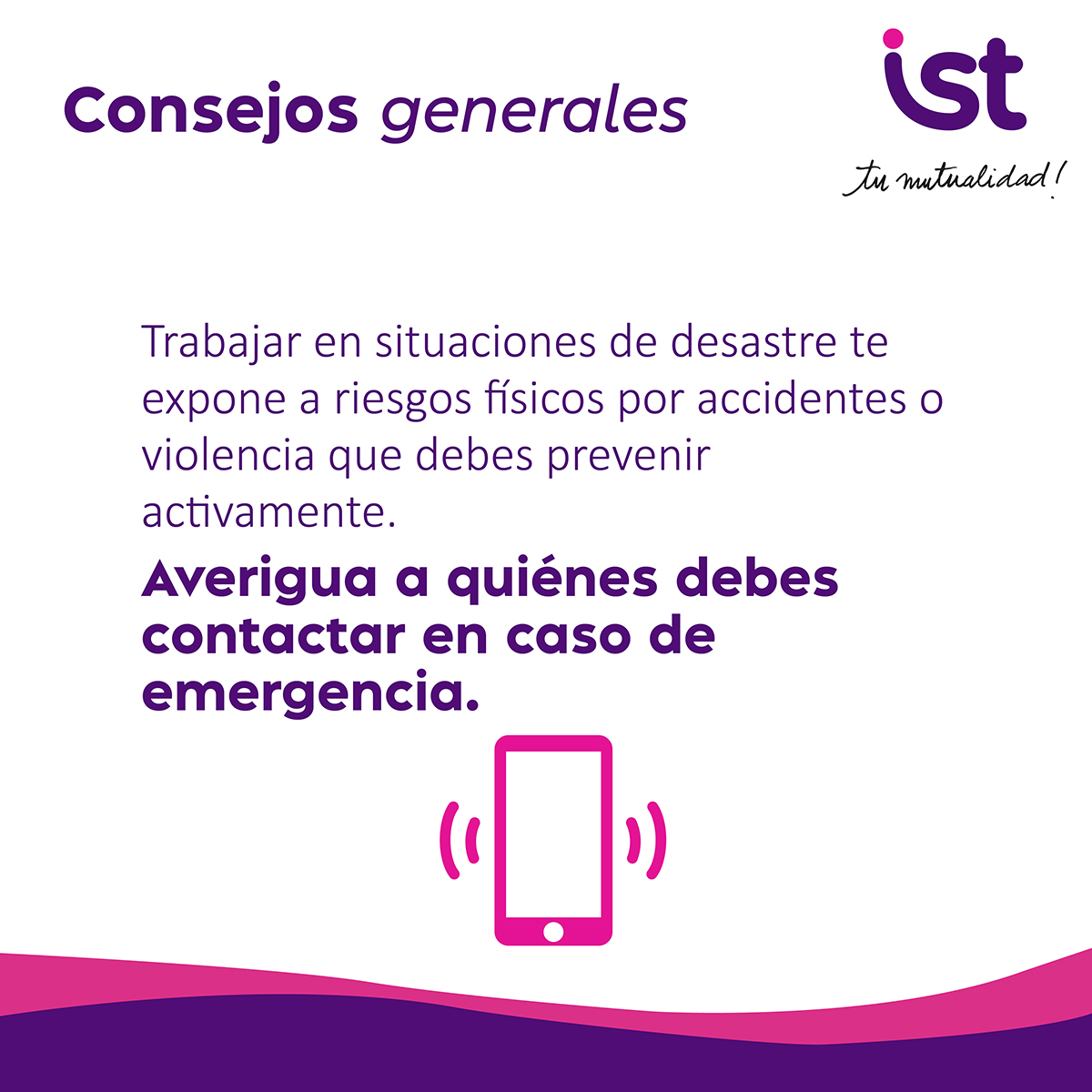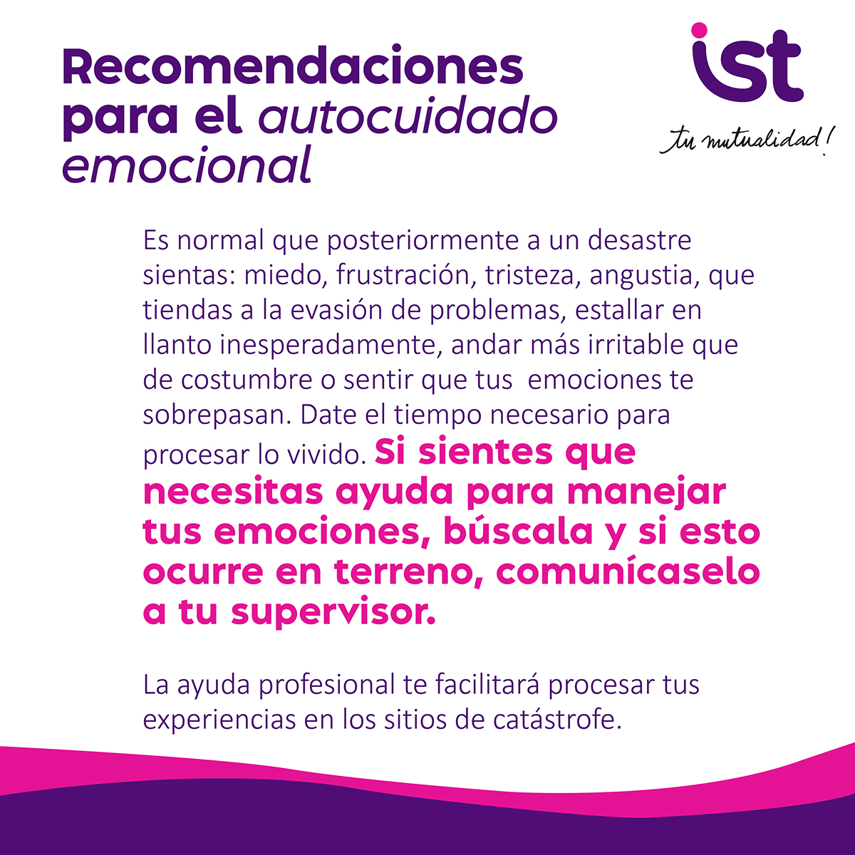 Situaciones de emergencia pueden generar angustia, estrés o incertidumbre. En IST te ofrecemos recomendaciones y apoyo para cuidar tu bienestar emocional, escuchar tus dudas y acompañarte en los momentos difíciles.