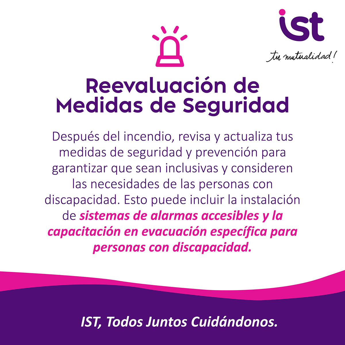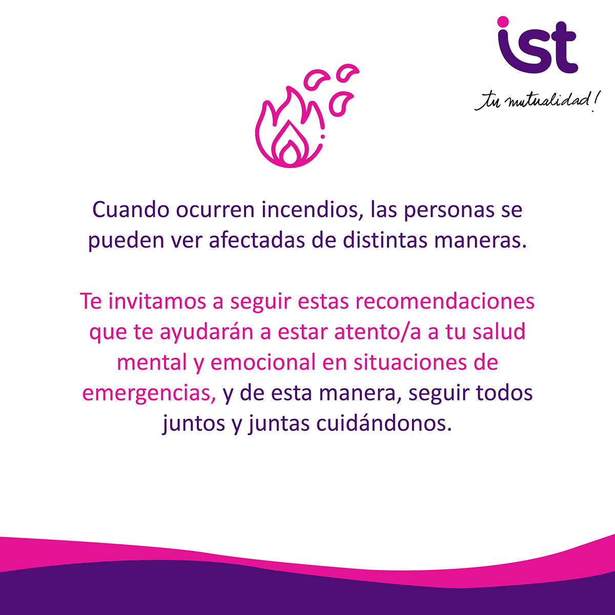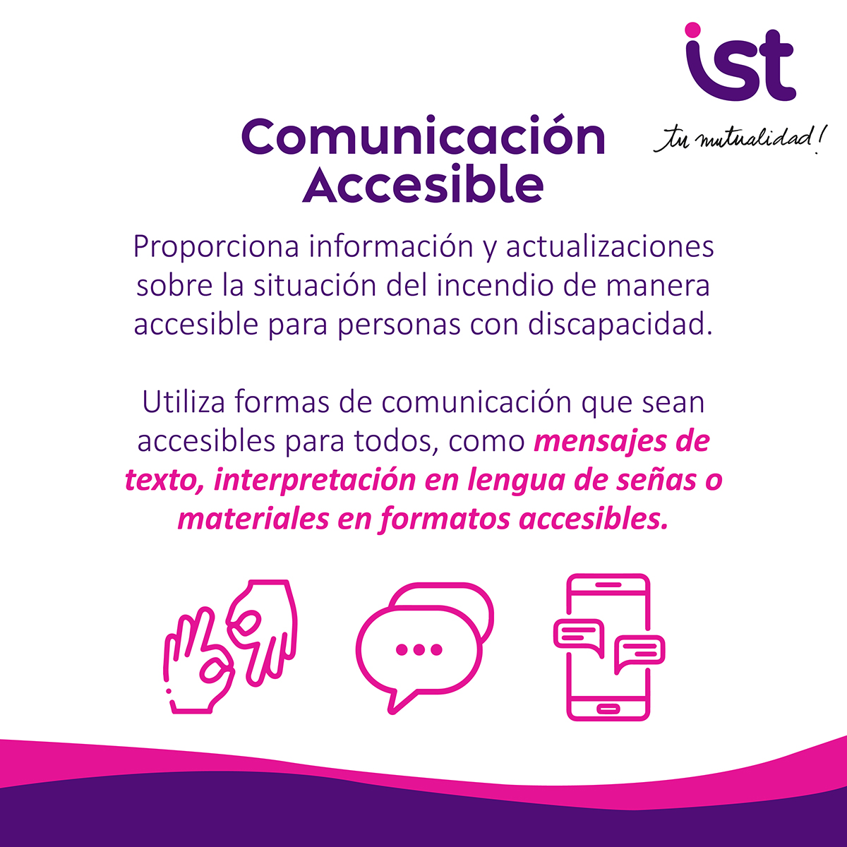 En incendios, todas las personas deben acceder a información y apoyo de manera clara y accesible. En IST promovemos una respuesta inclusiva que considere distintas necesidades, para que nadie quede fuera de la protección y el cuidado.