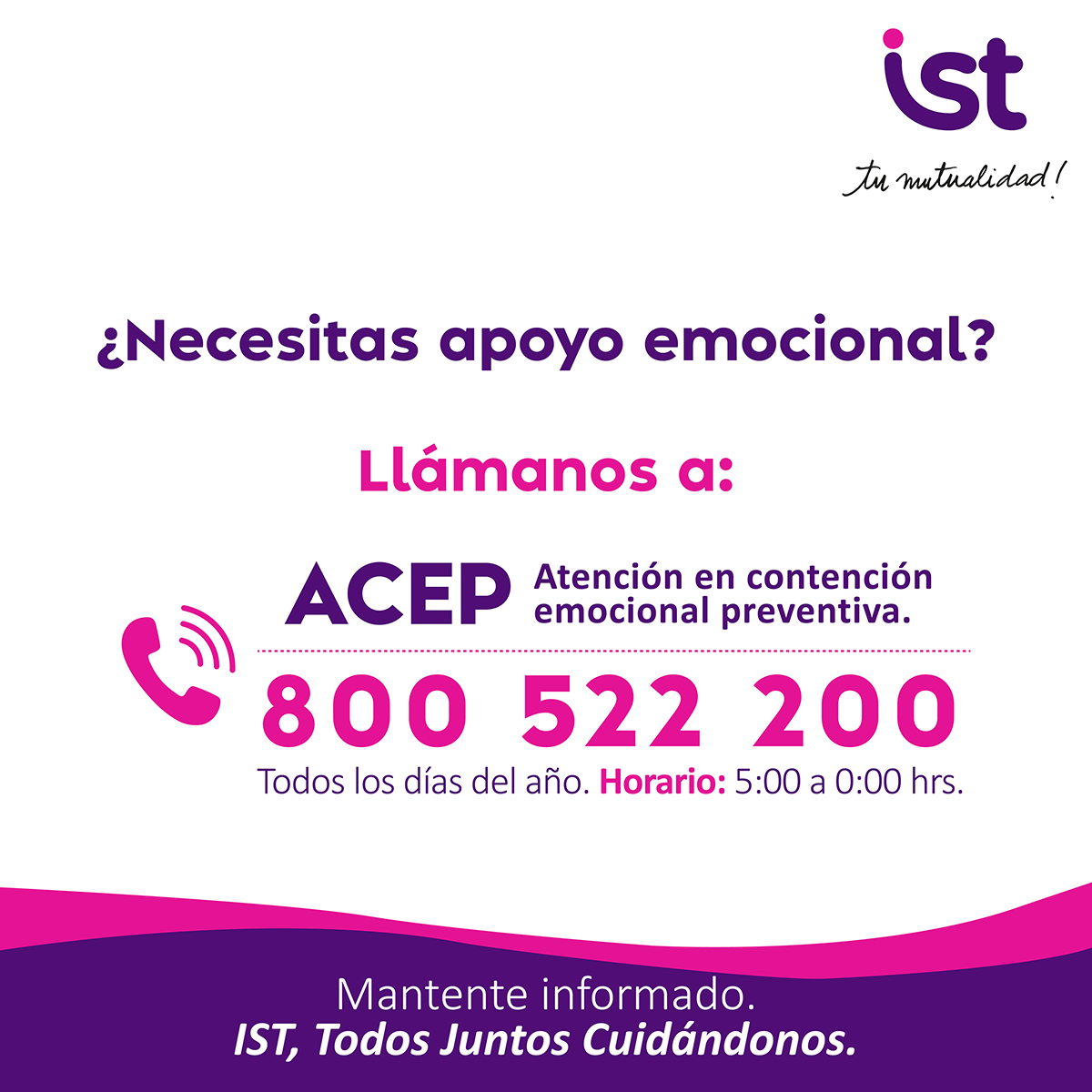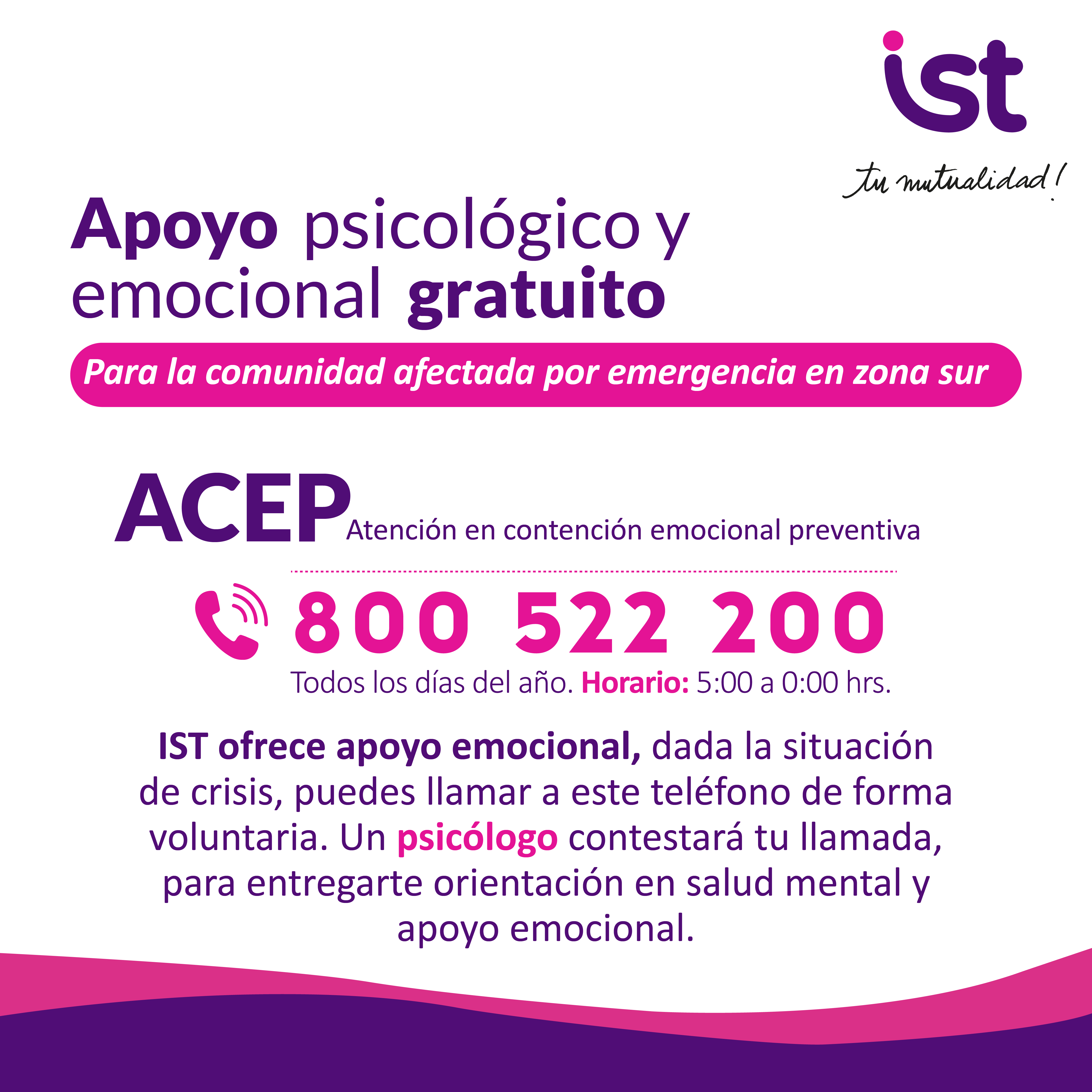 IST ofrece apoyo emocional, dada la situación de crisis, puedes llamar a este teléfono de forma voluntaria. Un psicólogo contestará tu llamada , para entregarte orientación en salud mental y apoyo emocional.